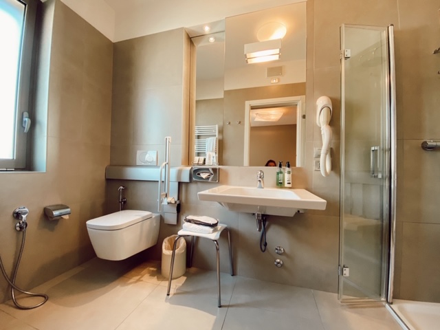 Viste le nostre esigenze e al fatto che eravamo in 3 persone, abbiamo optato per una camera standard che comunque ha permesso la fruizione con la carrozzina elettrica.